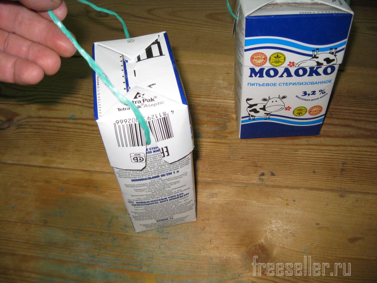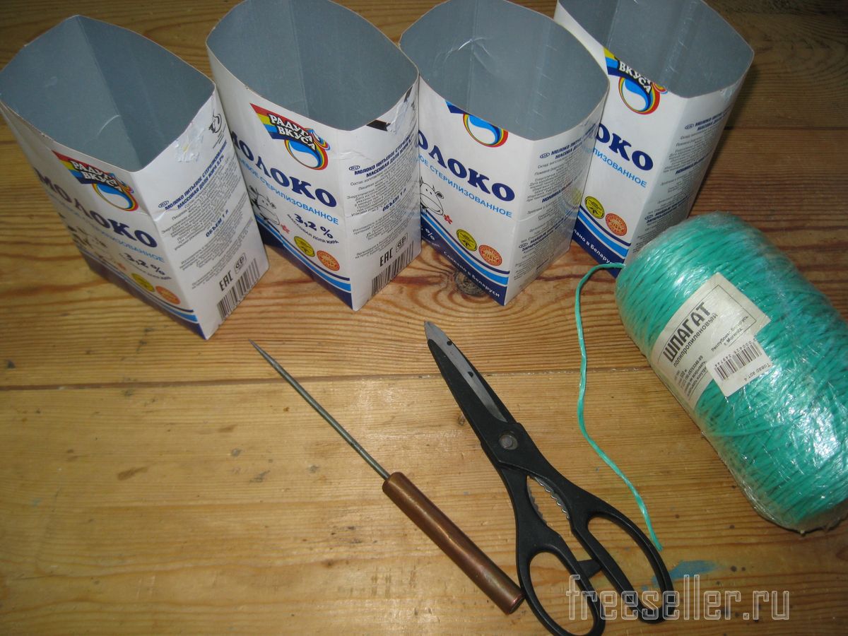 Для этого мне понадобились четыре чистых, вымытых и просушенных картонных пакета от молока с отрезанными верхушками, а также ножницы, шило и моток шпагата.