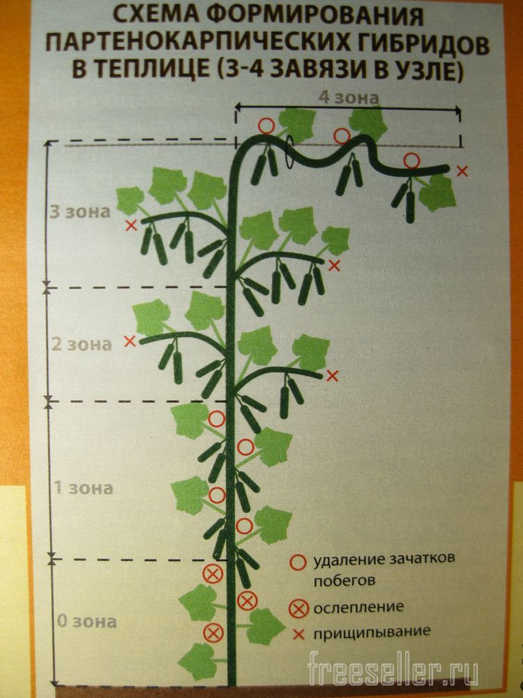 Как видно из этой схемы, формирование огуречного куста начинается с нижней части, так называемой нулевой зоны, это участок стебля, на котором находятся 3, 4 первых листа. В этой зоне, во всех пазухах листьев, проводят ослепление – выщипывание всех зачатков боковых побегов и завязей, не трогая сами листья.