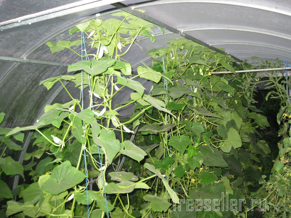 Такая схема формирования огурцов хороша тем, что растения как бы расширяются кверху, что положительно сказывается на их освещенности, а также удобстве ухода за ними (полива, подкормки, рыхления и т.п.) и сборе огурцов.