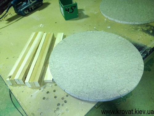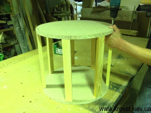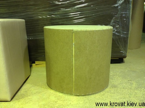 Вырезаем круг из ДСП или фанеры (общий диаметр пуфа в стандарте 45-50 см). Брус любой толщины. Высота пуфа по стандарту 45 см.