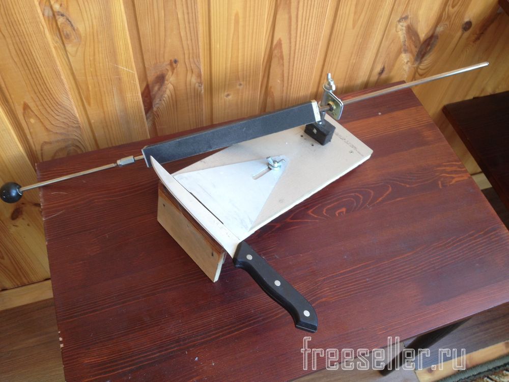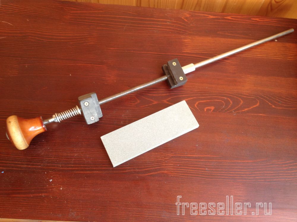 На поверхности (для упора затачиваемого ножа) устанавливаем подготовленный алюминиевый (или нержавейка) с прорезью в середине пластину (толщиной до 2мм.) с барашковым зажимом.