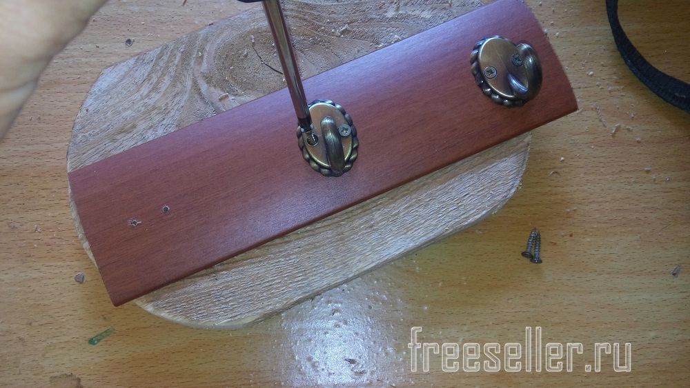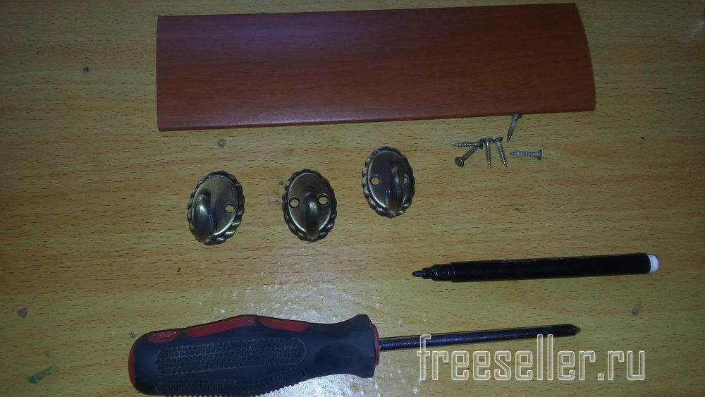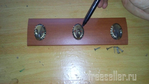 Затем ставим крючки на заготовку и тем же фломастером размечаем места будущих отверстий. Расположить крючки на заготовке можно как угодно, как подскажет Ваша фантазия, но я сделал всё стандартно с одинаковым отступом от краев и между ними.