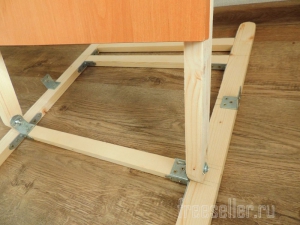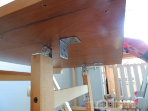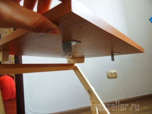 Далее взял 2 уголка, и закрепил в нижней части столешницы, они будут стопорить в нужном месте опору, вот таким образом.