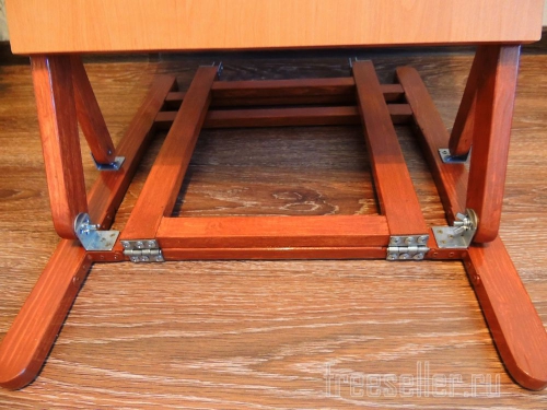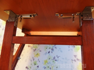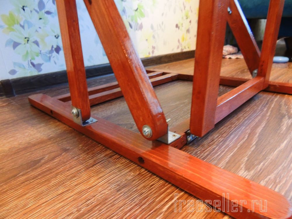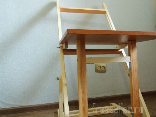 Откидывается столешница, далее опора, и замыкается щеколдой, и столик готов, наклон регулируется двумя вертикальными направляющими.