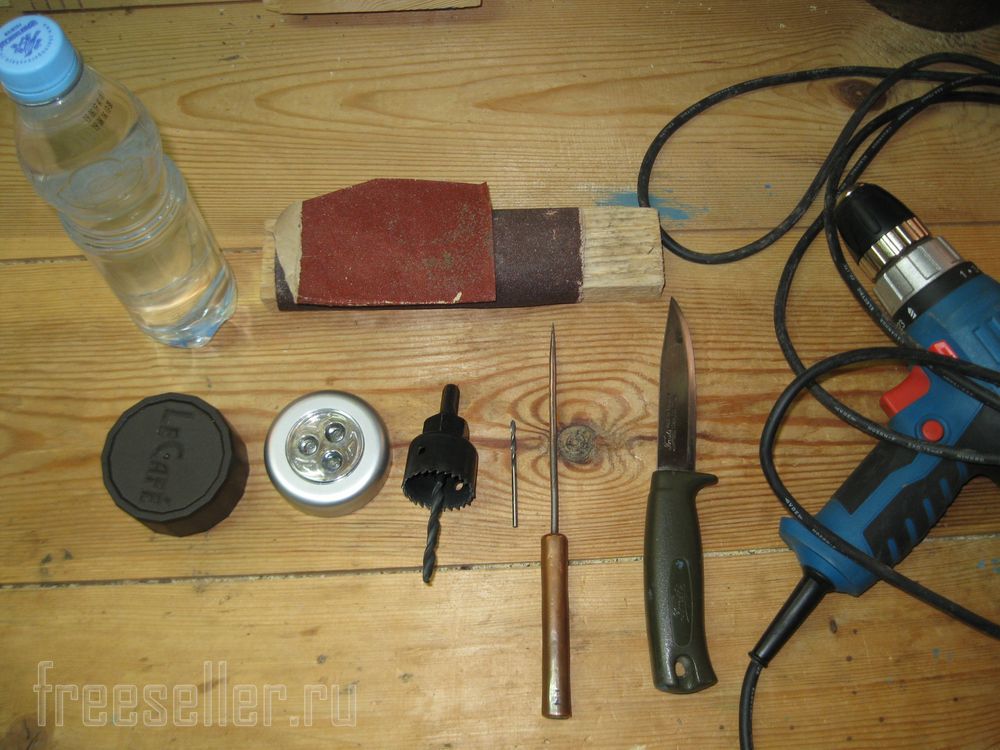 сама пластиковая крышка от кофейной банки, шило, острый нож, тонкое сверло по металлу, коронка по дереву диаметром 35 мм, электродрель, наждачная бумага и баллончик с краской.