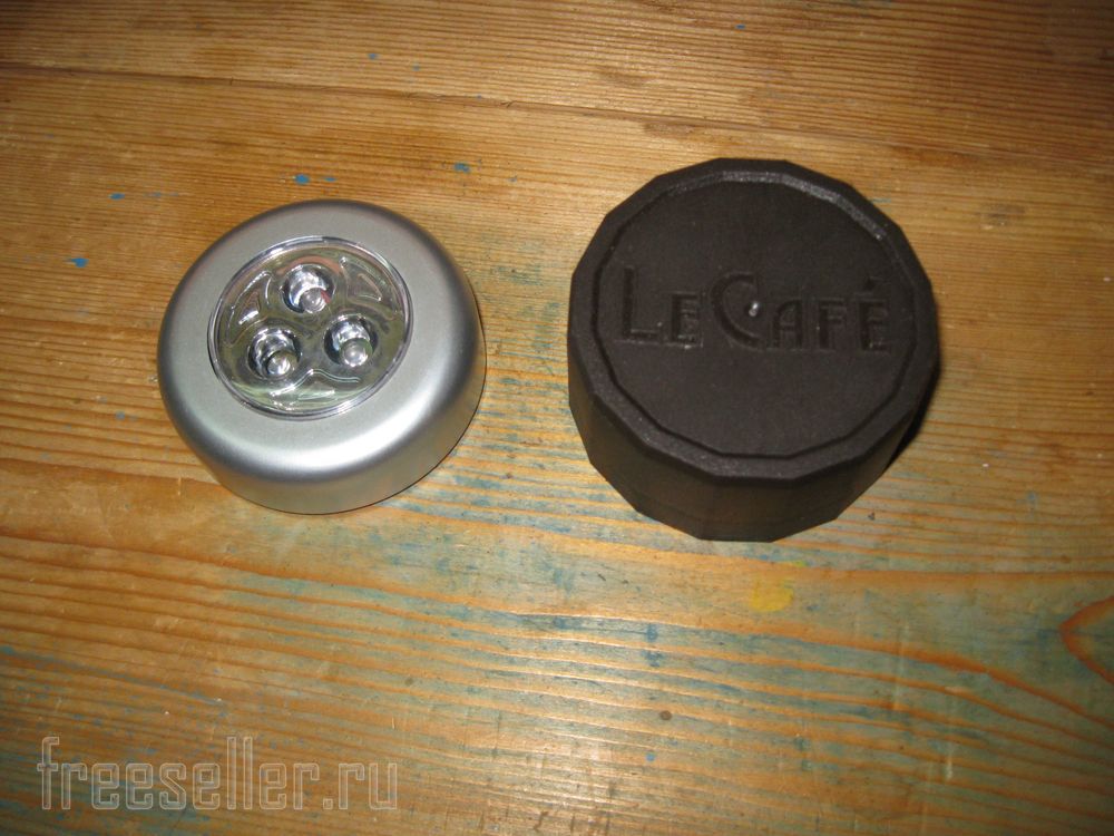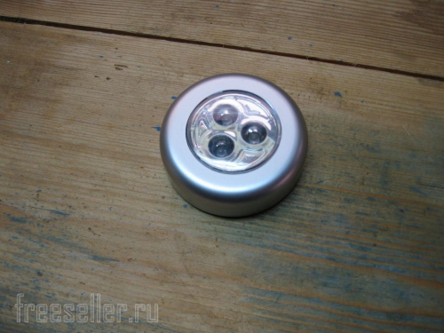 В итоге я решил сделать подсветку для бутылки с водой из нескольких ярких светодиодов на батарейках. Однако когда я начал рыться в своих запасах и искать у себя эти светодиоды, то неожиданно нашел вот такой китайский светильник, как раз, работающий на батарейках с тремя белыми и достаточно яркими светодиодами.