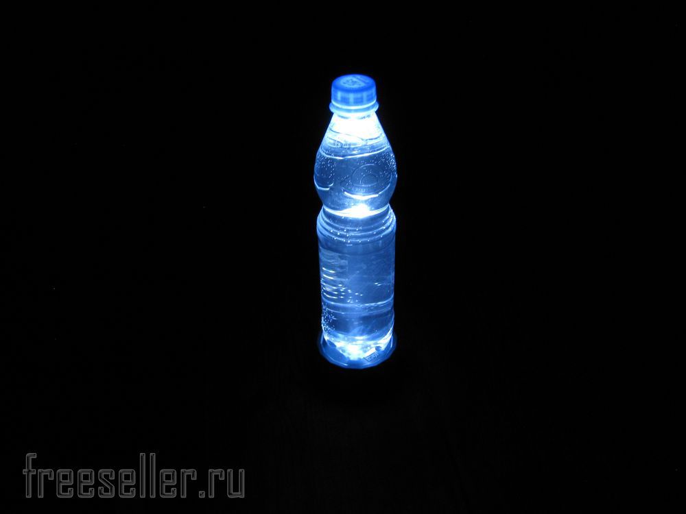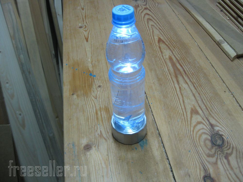 Ну а теперь включаем светильник, нажатием на него сверху через отверстие в подставке и ставим на саму подставку прозрачную пластиковую бутылочку с водой. Я выбрал бутылку 0,5 литра, поскольку она как раз хорошо и устойчиво стоит на этой подставке и не требует дополнительной фиксации.
