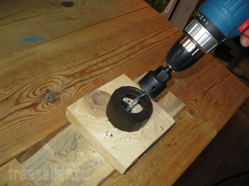 Сначала, для того чтобы коронка по дереву не ушла в сторону, я наметил шилом и просверлил отверстие в центре крышке сверлом по металлу диаметром 3 мм, а затем вырезал в ней отверстие диаметром 35 мм, при помощи коронки по дереву.
