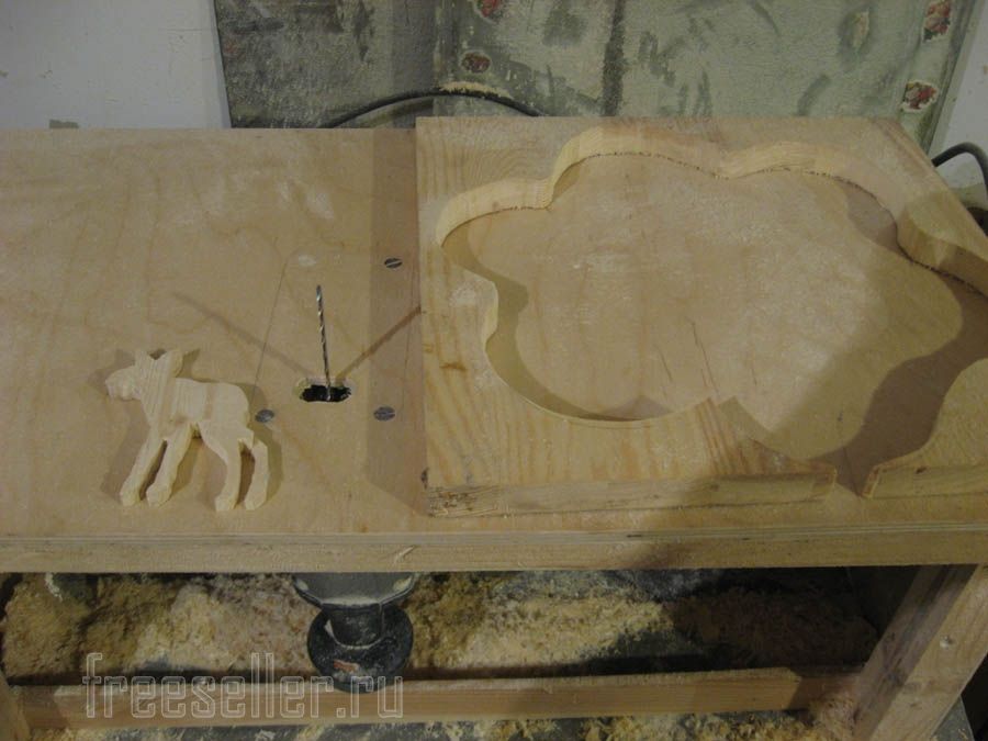 Лобзиком выпиливаем отверстия под пилку и под выход провода в задней стенке.