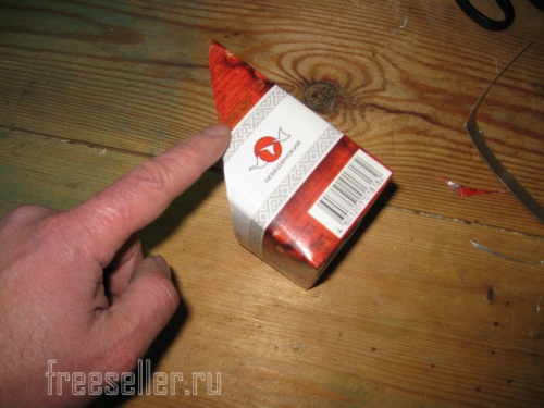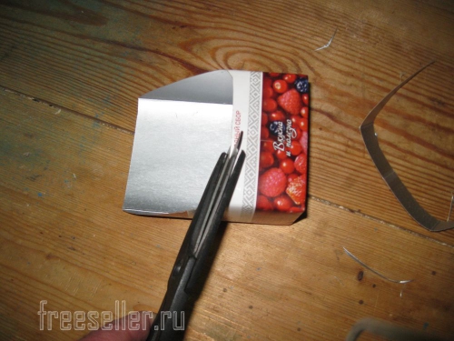 Для начала мы обрезаем ножницами картонный пакет вот таким образом, делая длинную заднюю стенку и короткую переднюю. Высоту передней стенки нужно делать в зависимости от размеров куска мыла, которое мы будем класть в эту мыльницу.