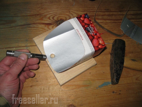 После этого в задней стенке мыльницы пробиваем отверстие при помощи пробойника и молотка, чтобы ее удобно было вешать на стену.
