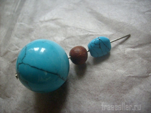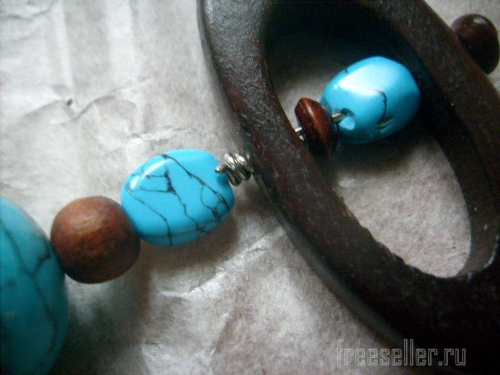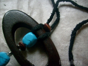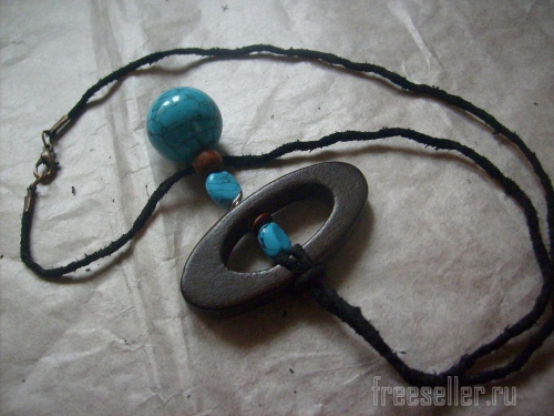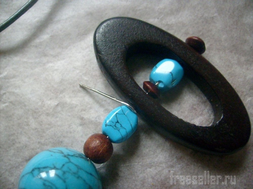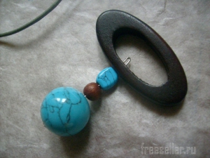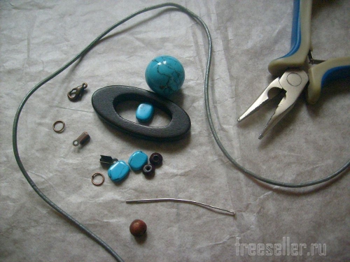 Собрать такую подвеску из готовых элементов можно очень быстро. Нужны лишь элементарные навыки работы с проволокой. Запастись для её изготовления придётся бусинами разного размера из натурального камня (у нас из прессованной бирюзы) и дерева, крупной деревянной основой с отверстиями под крепления, замшевым шнуром нужной длины и фурнитурой - двумя колечками, двумя зажимами для крепления их к шнуру, замочком-карабином, двумя бижутерными гвоздиками. В работе нам понадобятся ножницы, пассатижи и кусачки.
