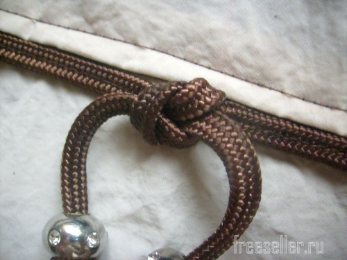 11. Надеваем бусины на концы шнура, фиксируем их узлами. Связываем концы шнура в узел.