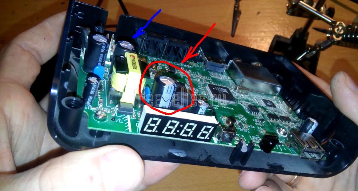 Теперь припаиваем новый кондей на место старого и как видно на фото, все отлично стало. (отметил синим).