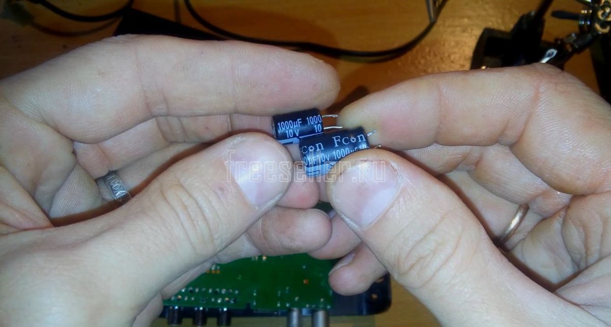 Затем выпаиваем конденсатор, смотрим параметры и ищем подходящий. В данном случае необходим 10 вольт и 1000 микрофарад, а так же 105 градусов Цельсия. Но в моем случае в наличии был только 10в1000мф и 95гц, и по размеру он чуть чуть меньше, но как показала практика, он отлично работает.