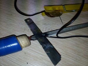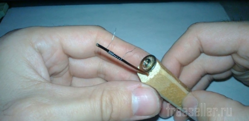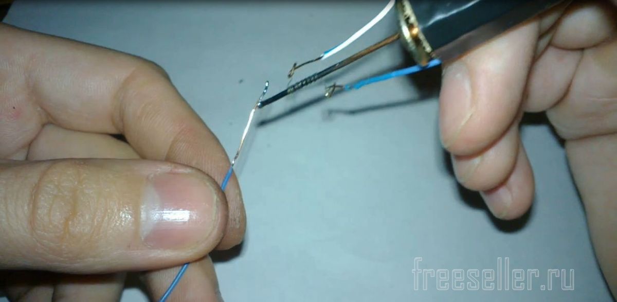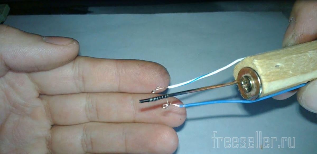 Прикручиваем два медных проводка к нихромовой проволоке как показано на фото.