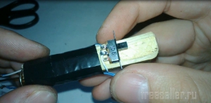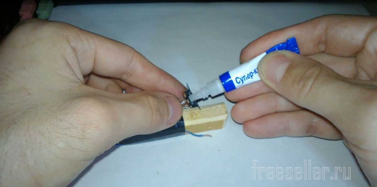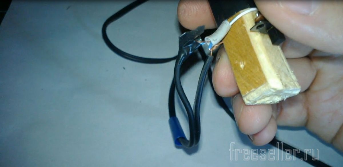 Приклеиваем выключатель к бруску, припаиваем проводки к выключателю и обматываем нижнюю часть бруска изолентой, чтобы зафиксировать провода.