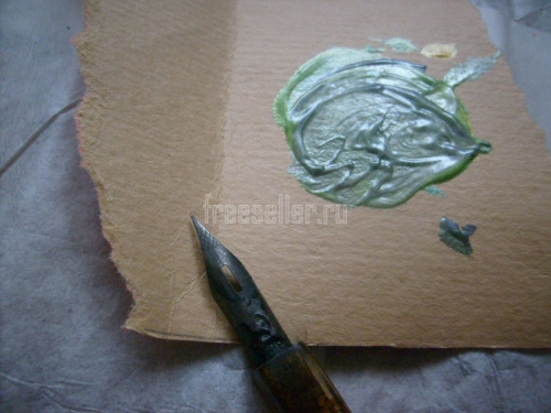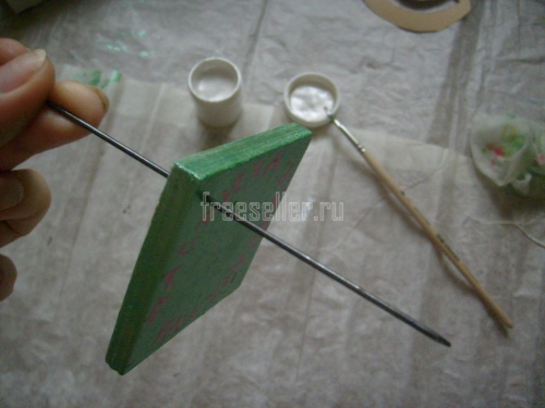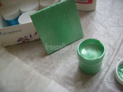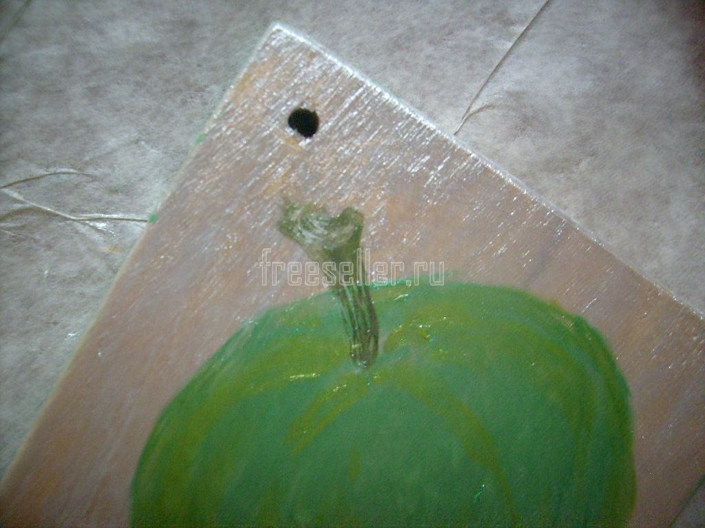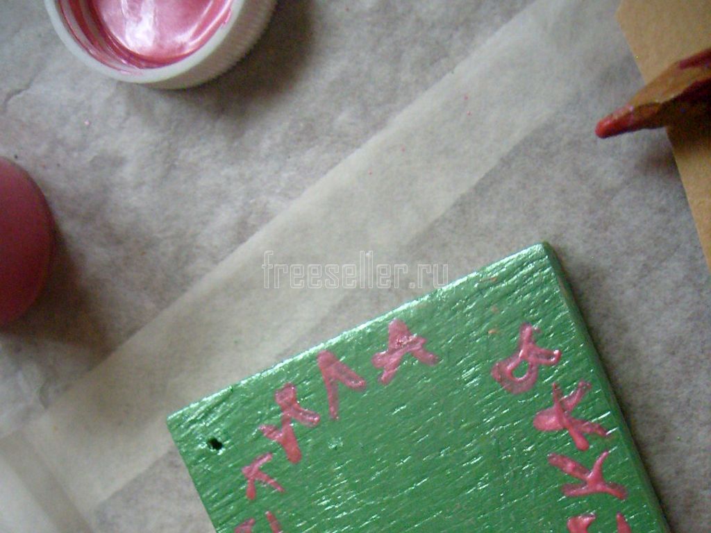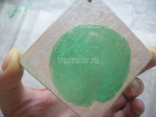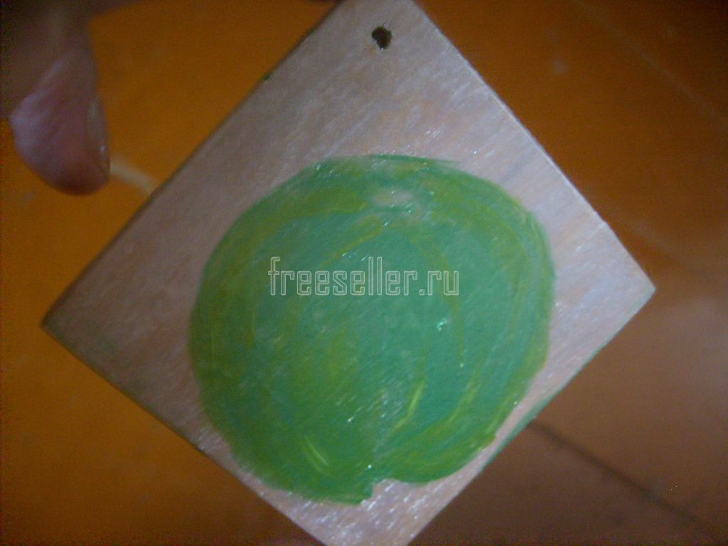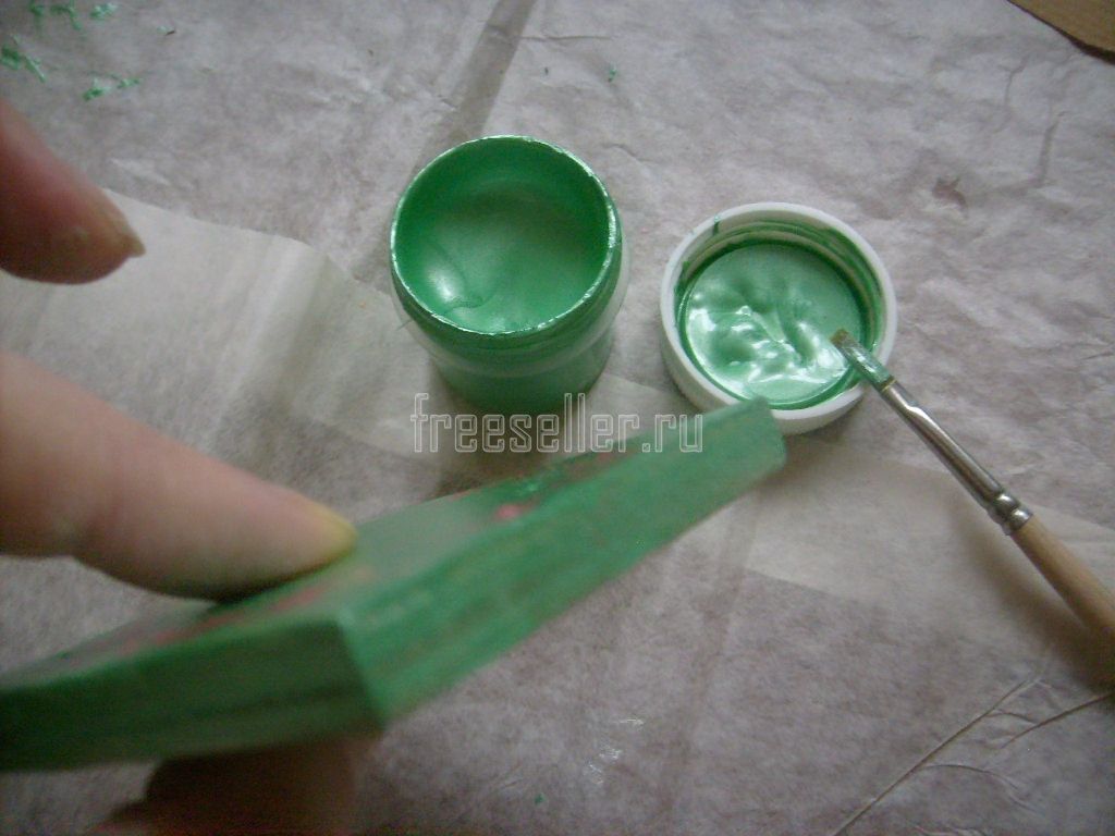 10. Высушив обе стороны дощечки, закрашиваем её рёбра зелёной краской.