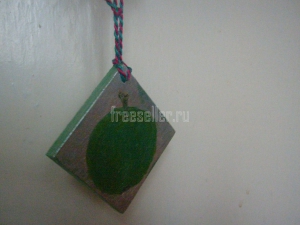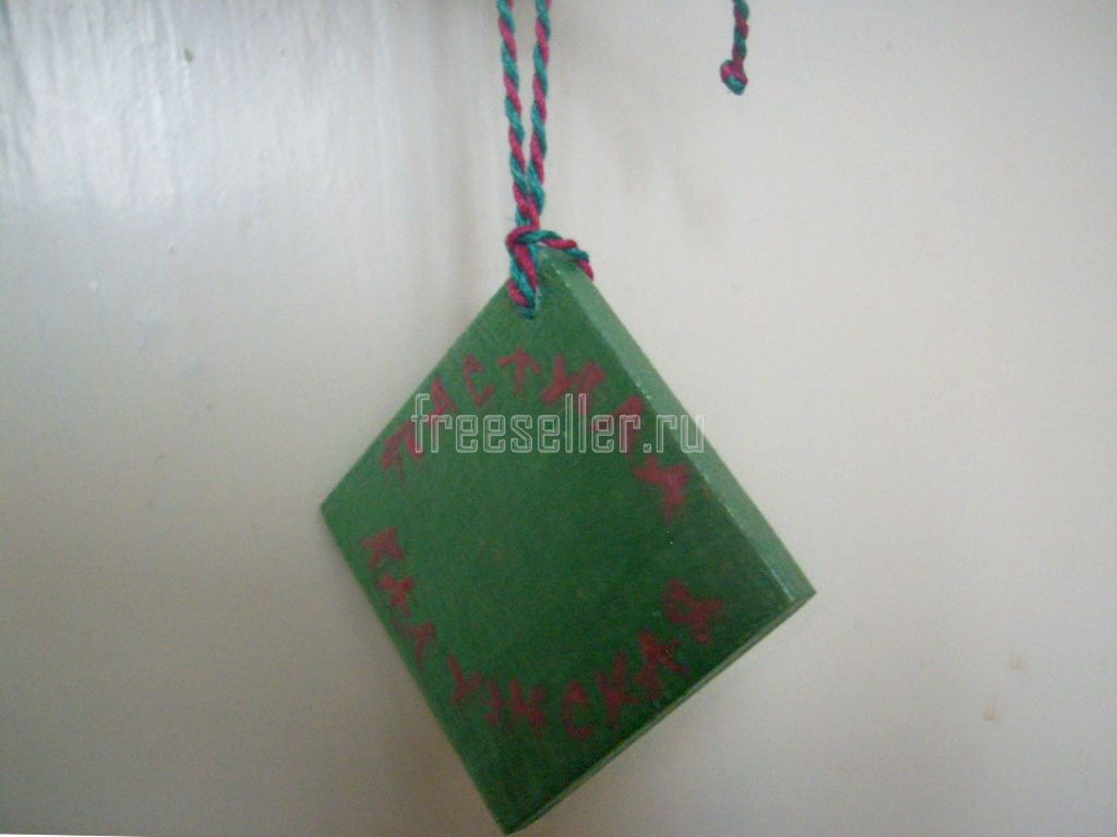 С одной стороны поместим картинку, например, эмблему компании или предмет, связанный с её деятельностью. В нашем случае - яблоко. С другой стороны будет надпись. Для изготовления сувенира нам понадобятся деревянная заготовка - квадратная дощечка с отверстием, наждак, клей ПВА, акриловые краски, кисти, карандаш, перо, салфетка, готовый шнурок или пряжа двух цветов.