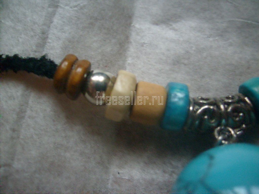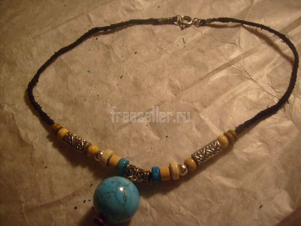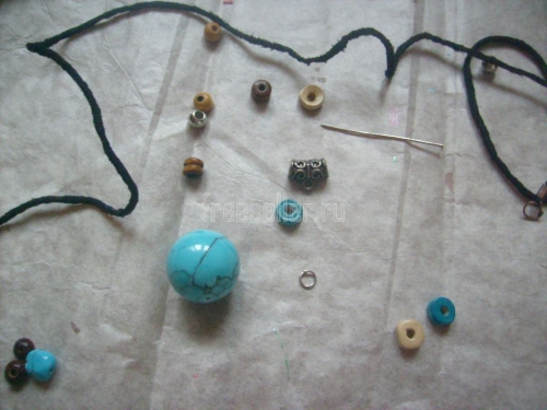 Основой нашего колье станет замшевый шнур, на который мы нанижем бусины разного размера, цвета, из разных материалов. Эклектика придаст ему оригинальный вид с этническим оттенком. Большая бусина нам понадобится всего одна, остальные нужны парные или в чётном количестве. Кроме них, запасёмся маленьким бейлом, бижутерным гвоздиком, замочком, колечками и тонкой проволокой для крепления застёжки.