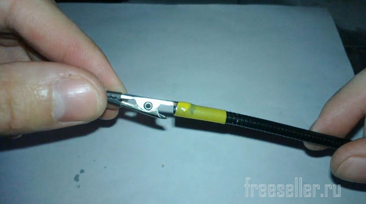 Супер клеем приклеиваем крокодильчик к концу гибкой ножки. Клей не жалеем) После того, как клей высохнет надеваем термоусадку 5 мм(она придаст хорошую фиксацию крокодильчика с гибкой ножкой) как показано на фото. И повторяем это же со второй ножкой и крокодильчиком.