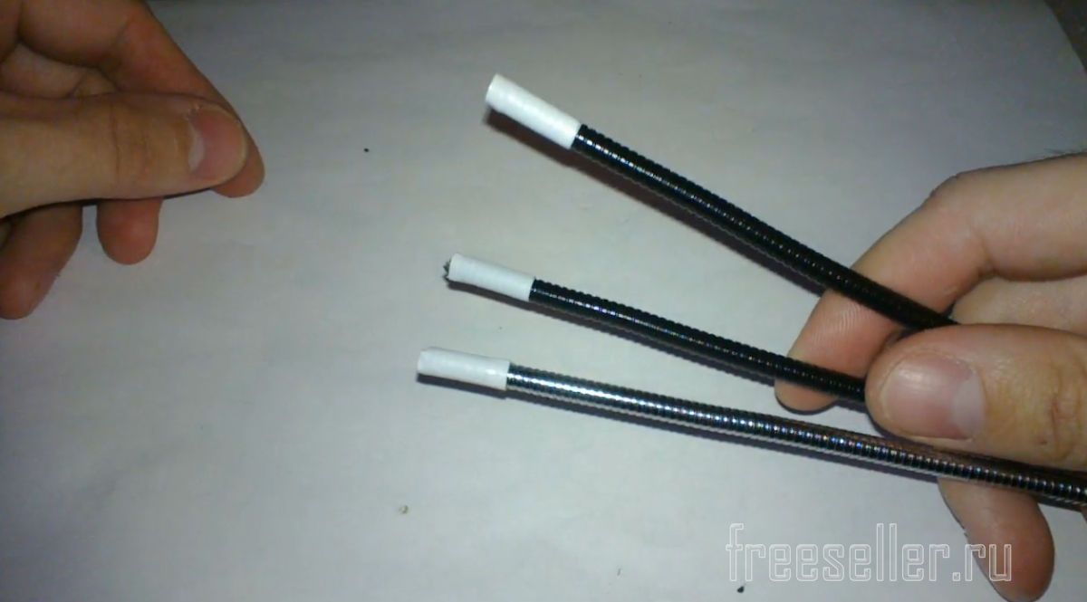 Нам понадобятся 3 гибкие ножки “Гусиные шеи” по 20см каждая. Я их взял из USB фонарика и USB вентилятора купленные в фикс прайсе по 60руб. У USB фонарика гибкая ножка 39 см, ее можно разрезать пополам перекусив плоскогубцами или кусачками получив 2 по 19 см.