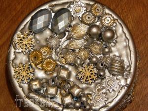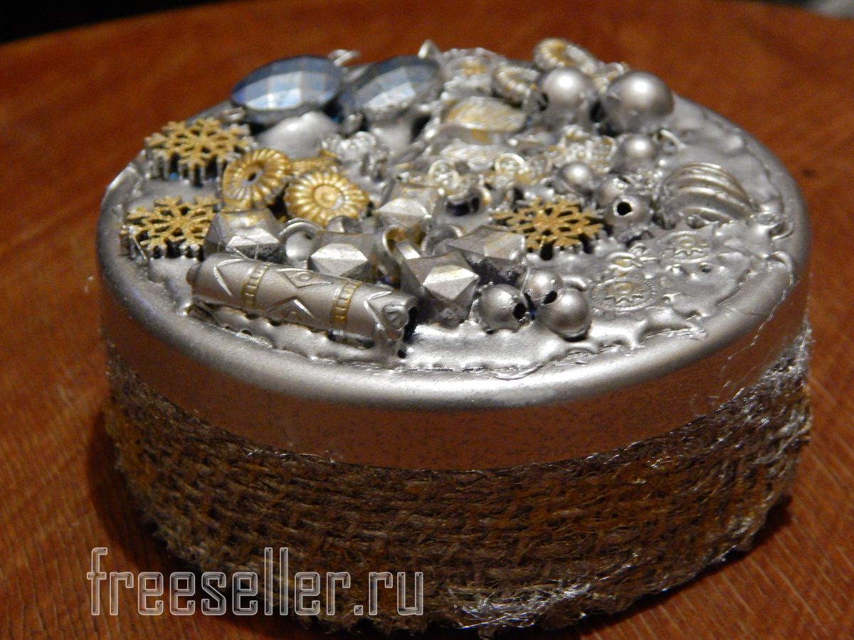 1. На крышку коробочки при помощи термоклея приклеиваем разные бусинки, ракушки, цепочки , в общем любые мелочевки, завалявшиеся в загашнике. В художественном беспорядке.
