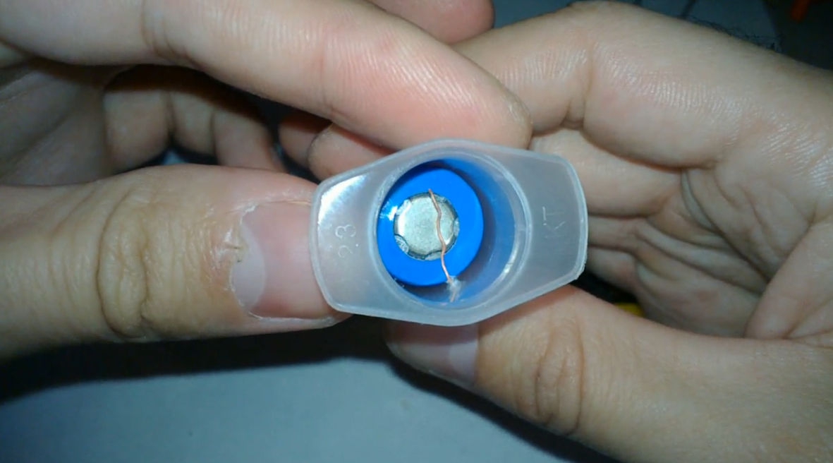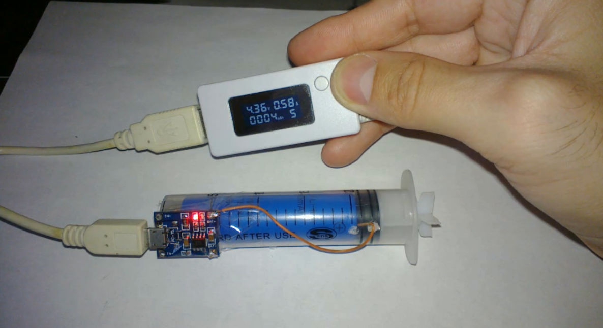 После того, как продели провод в проделанное отверстие и зафиксировав поршнем батарею, можно начинать тест зарядного устройства.