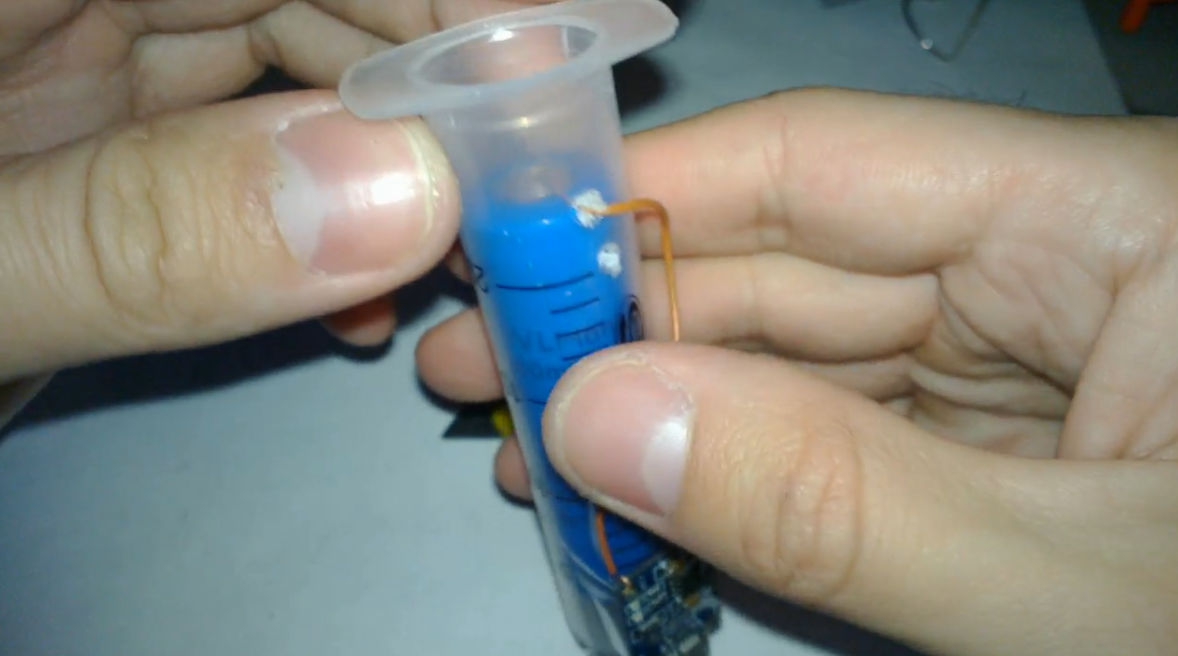 Проделываем отверстие в шприце для медного проводка, чтобы он мог касаться плюсового контакта батареи. Отверстие надо делать на уровне, когда батарея не зафиксирована поршнем шприца. На фото видно, что я ошибочно сделал одно нижнее отверстие в зафиксированном положении батареи.