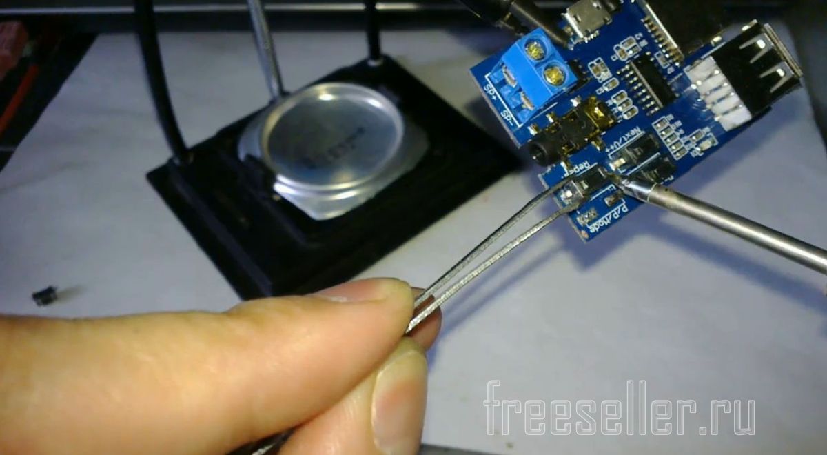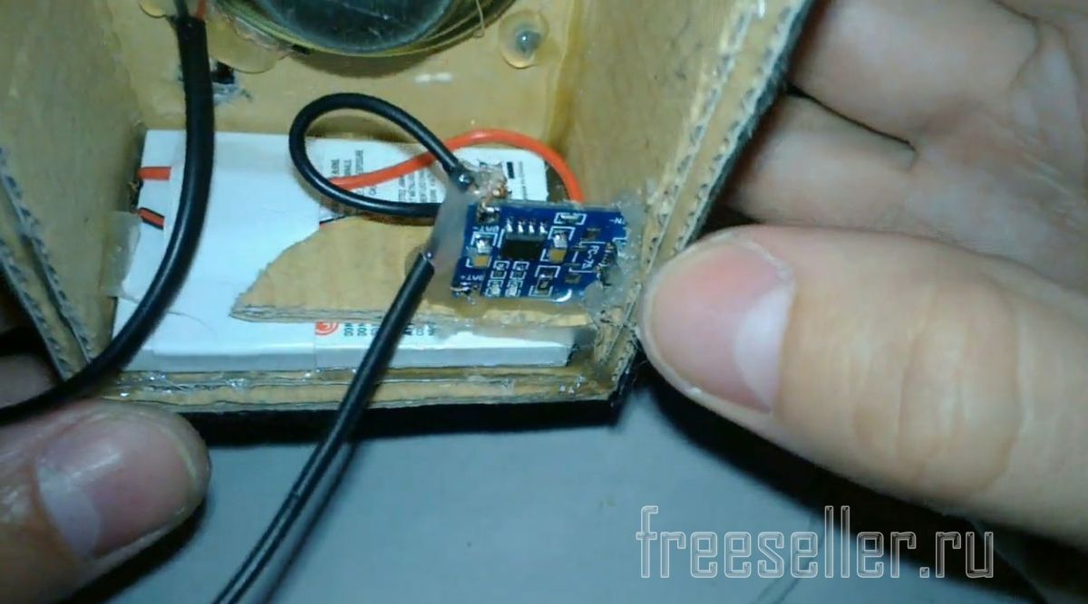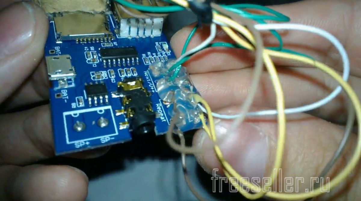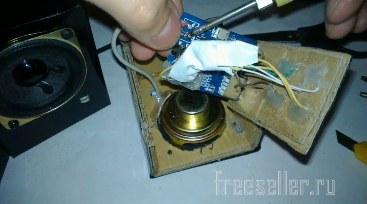 Скручиваем провода двух динамиков и припаиваем их к плате плеера соблюдая полярность.