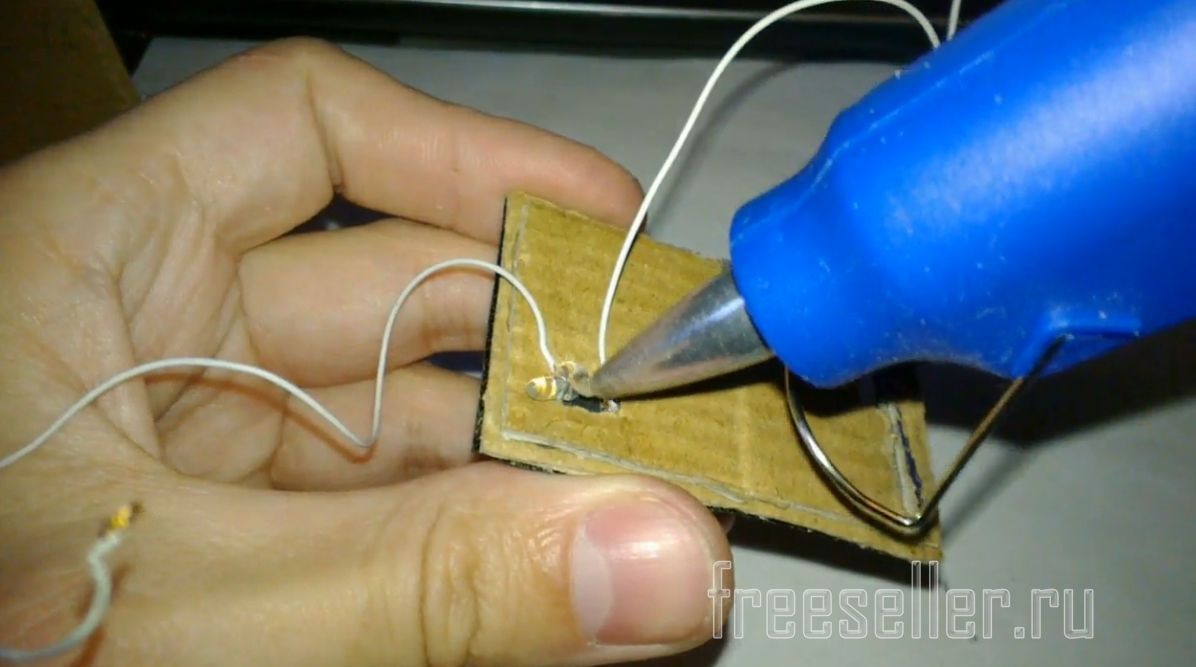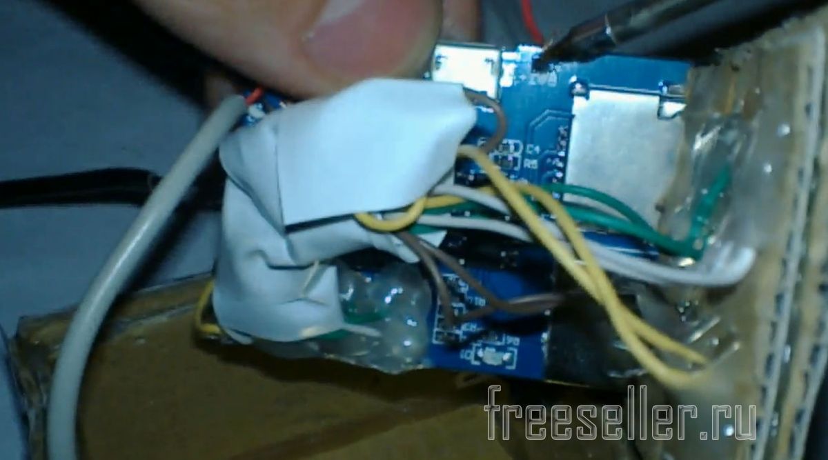 Заливаем места пайки термоклеем для надежной фиксации проводков. Можно их собрать в кучу и обмотать изолентой, чтобы не мешались.