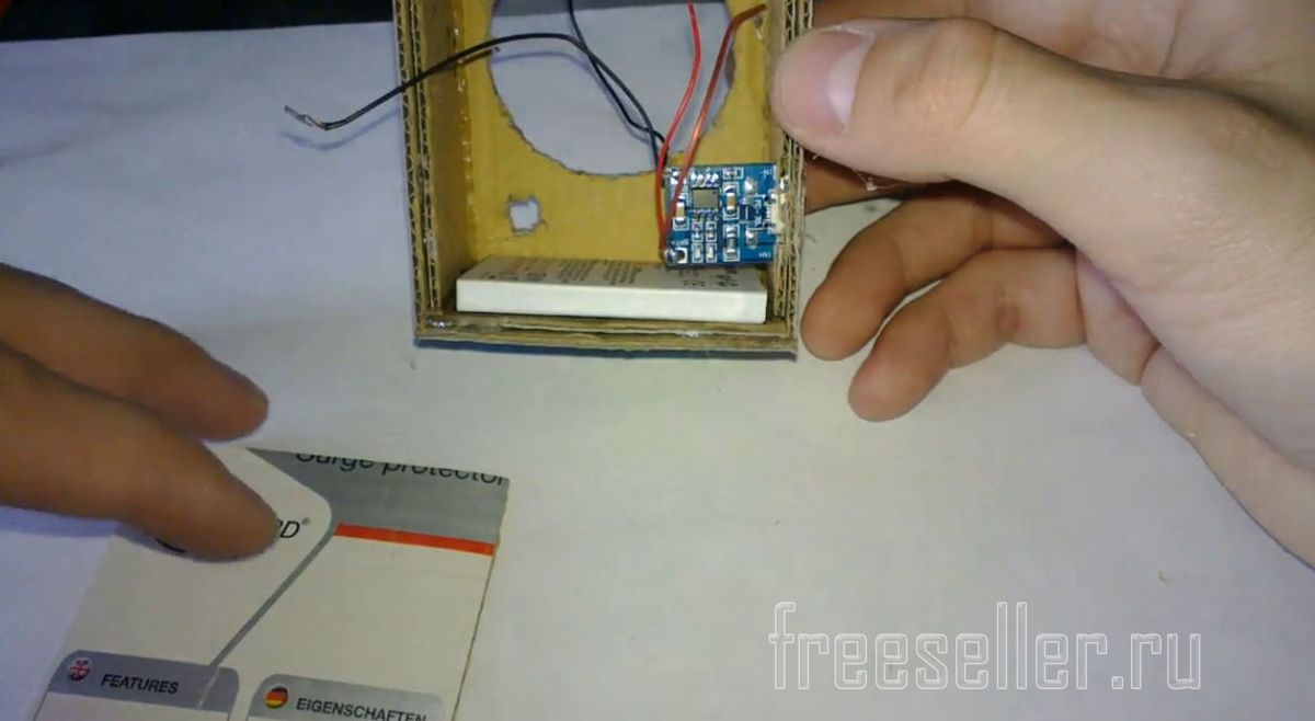 Приклеиваем верхнюю часть корпуса и фиксируем модуль заряда термоклеем для надежности.