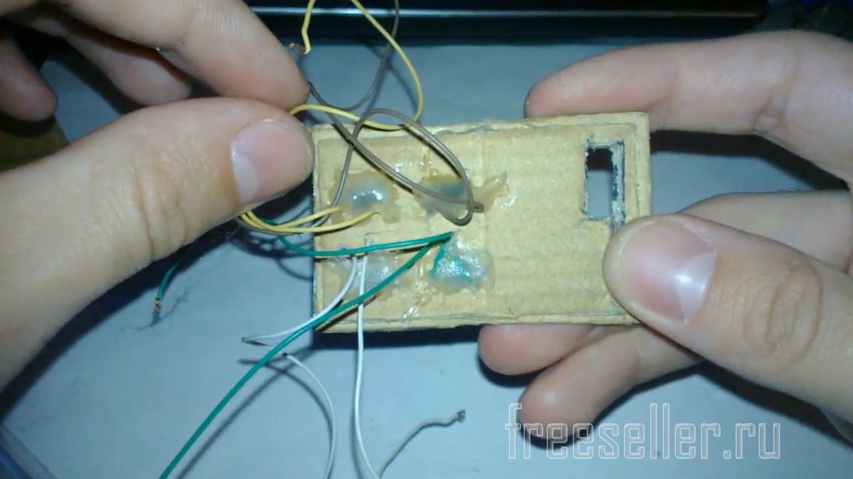 Проделываем прорези для проводов идущих к первой колонке, фиксируем их термоклеем с внутренней стороны и проверяем работу модуля перед креплением задней части корпуса.