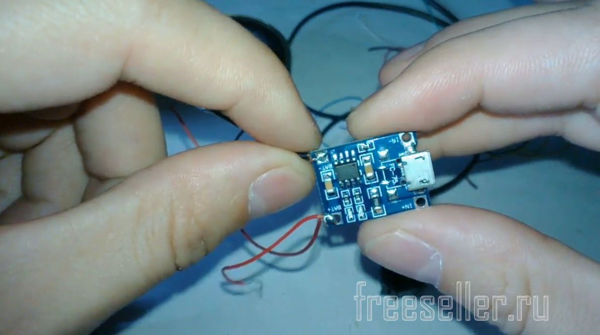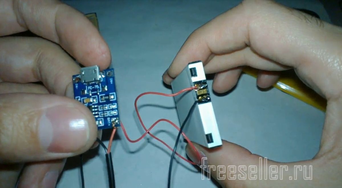 Соблюдая полярность припаиваем одну пару проводов от модуля заряда к аккумулятору.