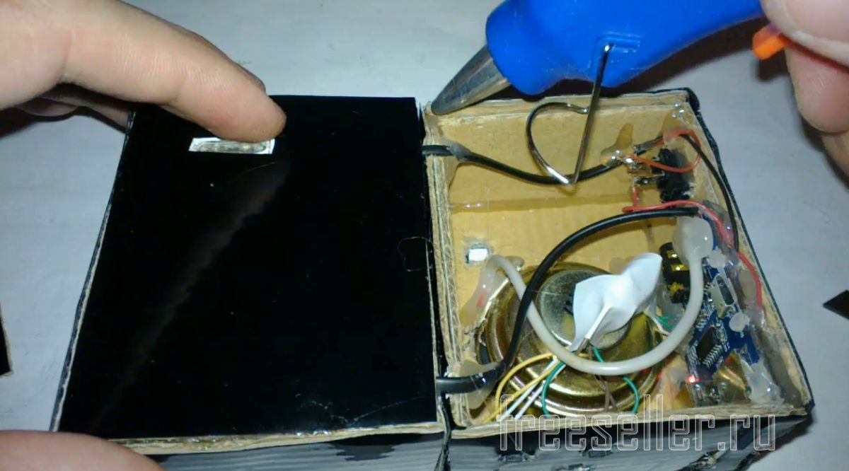 Болтающиеся части и провода фиксируем внутри термоклеем. Проверяем работу плеера перед креплением задней части корпуса.