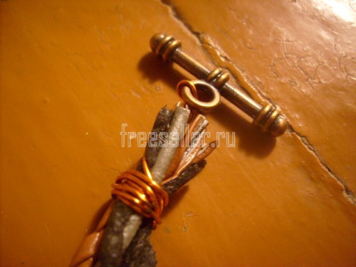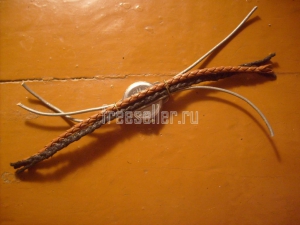 Продев проволоку в кольцо пряжки-застёжки, скручиваем её несколько раз - закрепляем пряжку. Затем плотно наматываем оба конца проволоки на "хвост" жгута.