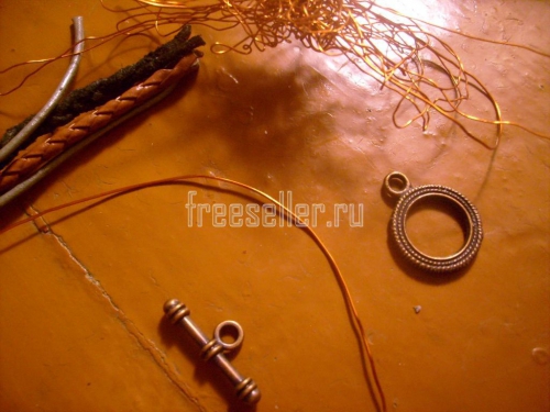 Ремешок мы составим из нескольких компонентов. Остатки кожаных шнуров разной фактуры, толщины, разного цвета, собранные в жгут, послужат основой ремня-браслета. Ещё нам понадобятся толстая и потоньше проволока, лоскуток кожи, замочек из двух частей, суперклей, пассатижи и ножницы.
