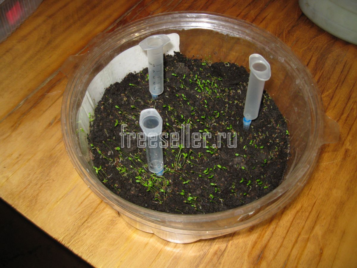 Когда визуально будет заметно, что вся земля в нашей емкости для рассады пропиталась водой, полив можно закончить. При этом сами шприцы снимаем и убираем, а колпачки так и оставляем в земле.