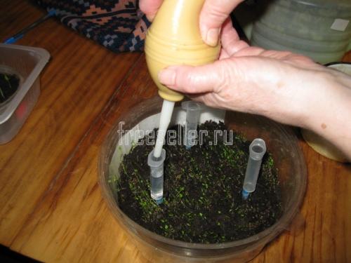 Ну а теперь заливаем в эти шприцы воду, предназначенную для полива. Делать это можно резиновой грушей или спринцовкой, а можно использовать шприц большей емкости.