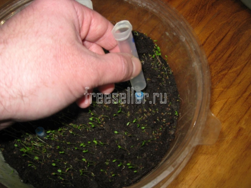 Налитая в шприцы вода достаточно быстро впитывается в землю, причем происходит это под землей и только когда вся толща земли пропитается водой, она постепенно начинает выходить на поверхность. Таким образом, смачиваются водой только семена, а сами ростки остаются сухими. Для полноценного полива, каждый шприц можно наполнить по два – три раза.