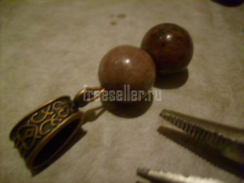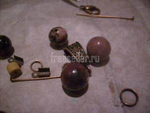 1. Собираем подвеску - центральный элемент. На бижутерный гвоздик нанизываем родонитовые бусины-шарики.