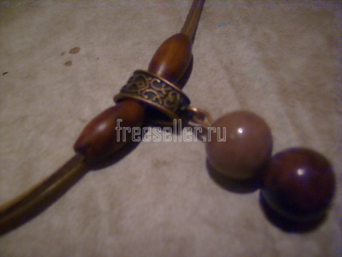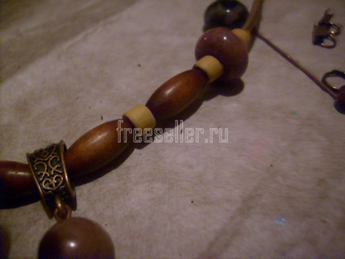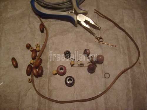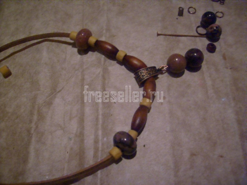 Весна пока не балует нас яркими красками, но и в бурой гамме есть своя прелесть. Вдохновимся ею и смастерим колье в комплект к этому браслету (Кожаный браслет себе или в подарок). Для его изготовления нам понадобятся замшевый шнур длиной 45 см, родонитовые бусины (2 шарика и 2 пандоры), деревянные бусины разной формы, фурнитура - бейл, бижутерный гвоздик, замочек, 1 большое кольцо, 2 маленьких соединительных, 2 карабина. В работе нам пригодятся пассатижи и тонкая спица.