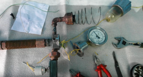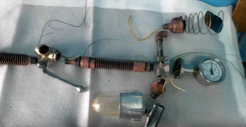 Я не покупал для него никаких деталей, делал из того, что находил дома и на работе. Краном включается сет, а манометр показывает давление.