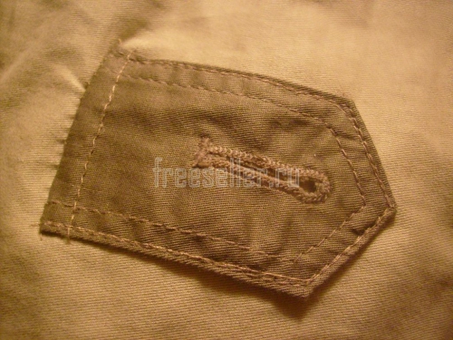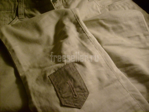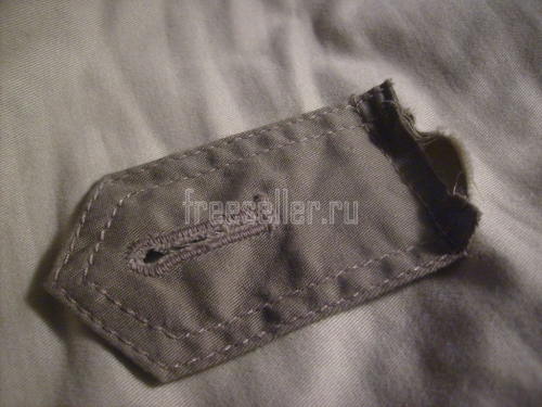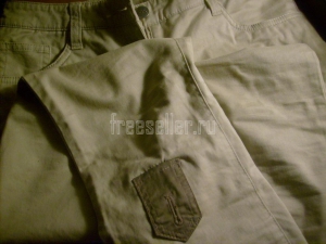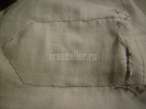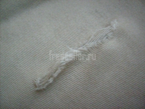 4. Пристрачиваем заплатку поверх прорехи. Шов прокладываем в строчку погона, полностью закрывая повреждённый участок брюк.