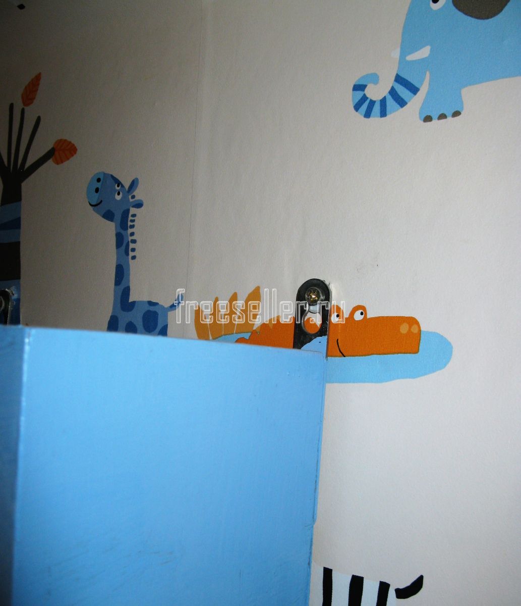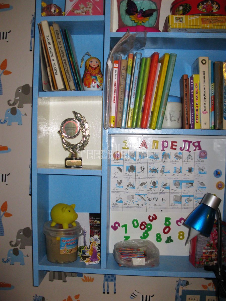 5) покрасили несколько отсеков полки белой краской в несколько слоев (там будут стоять награды, кубки ребенка – то, что мы хотели подчеркнуть, и чем он очень гордится), остальное покрыли нежно-голубой краской (гармонировал с цветом стен) – чтобы добиться нежного оттенка, просто добавили в белую краску цветную синюю эмаль и развели;
