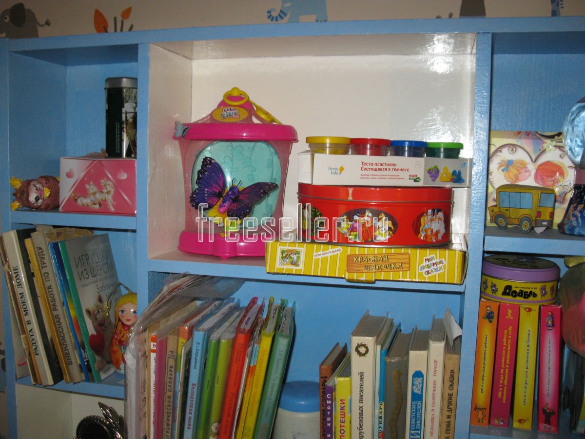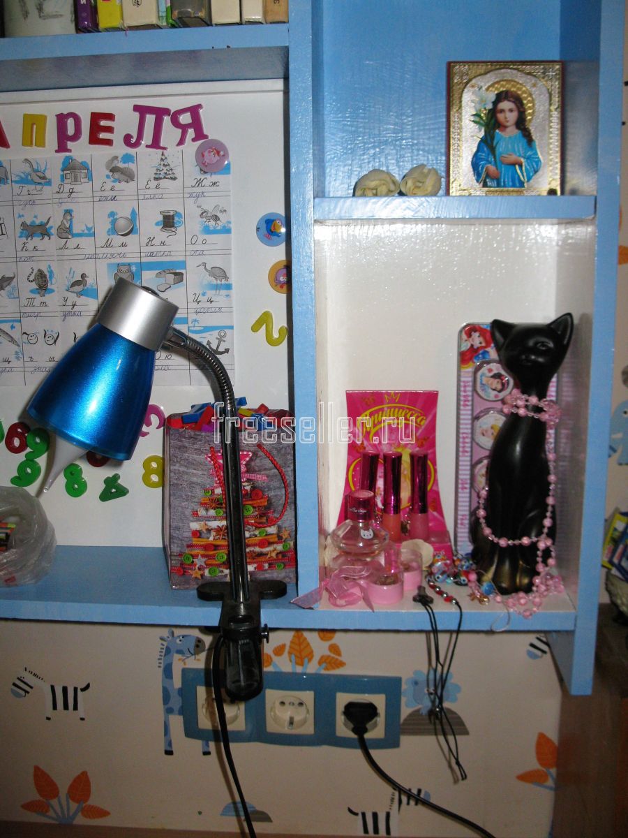 Затем полку повесили на стену над розеткой и рабочим столом ребенка, расставили предметы (книжки, материалы для творчества, коробочки с нужными мелочами, игрушки). На магнитную доску повесили магниты, буквы алфавита. На нижнюю полку прикрепили для освещения лампу-прищепку.