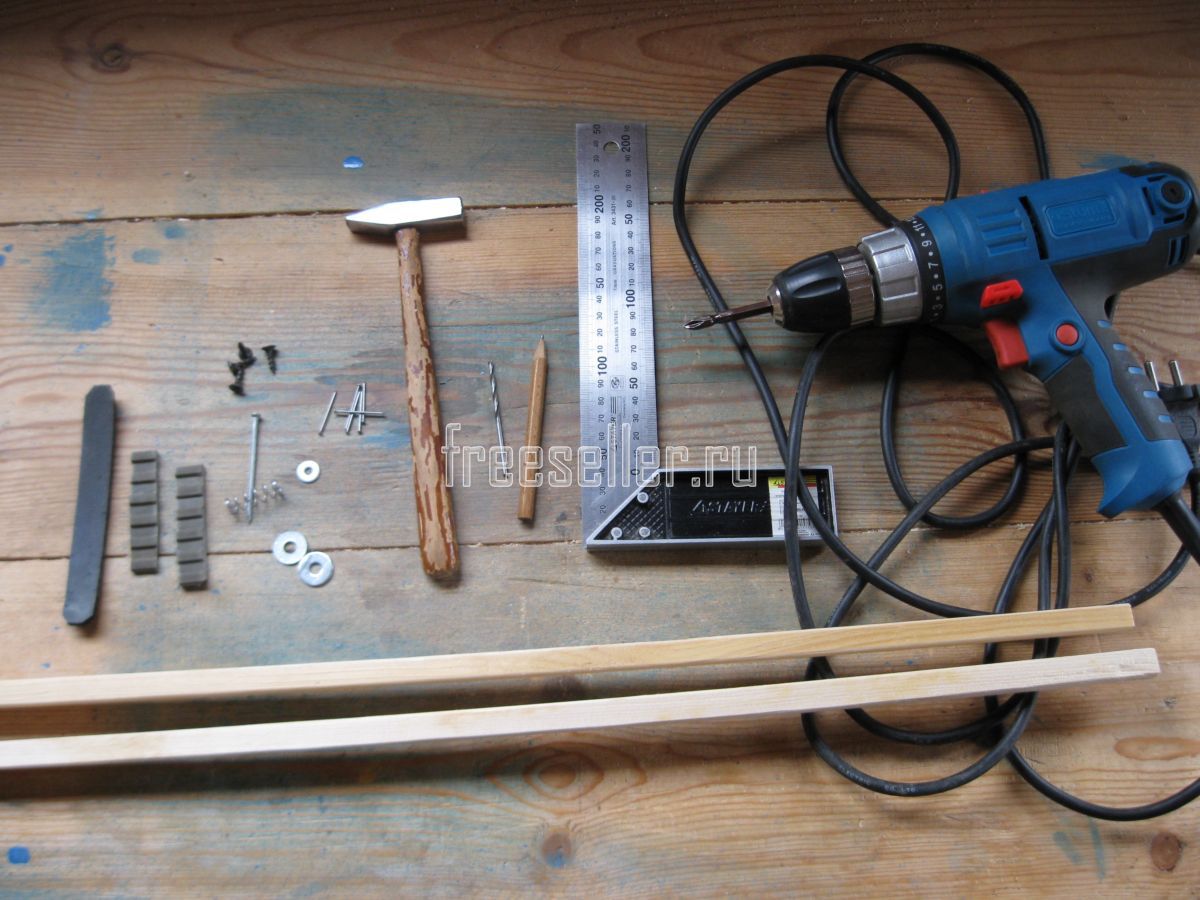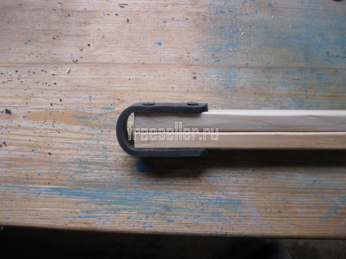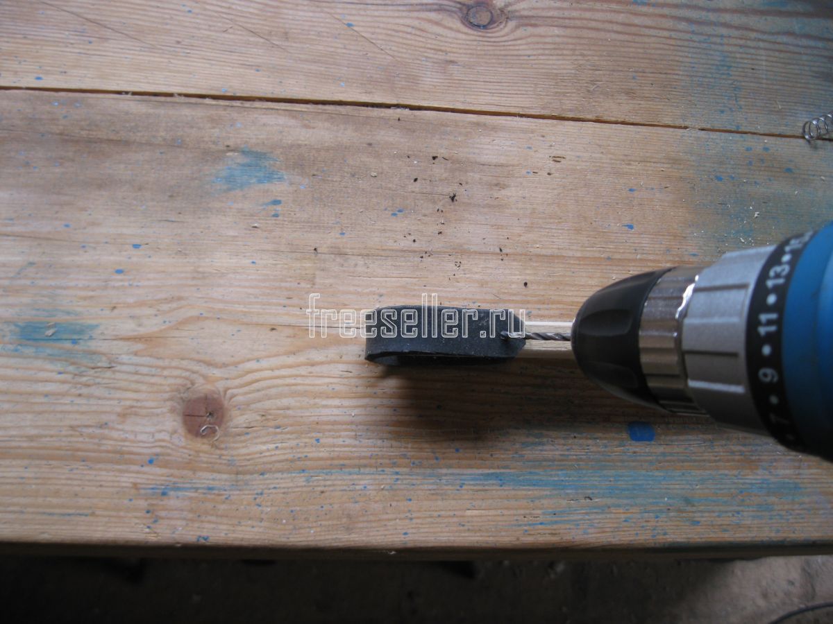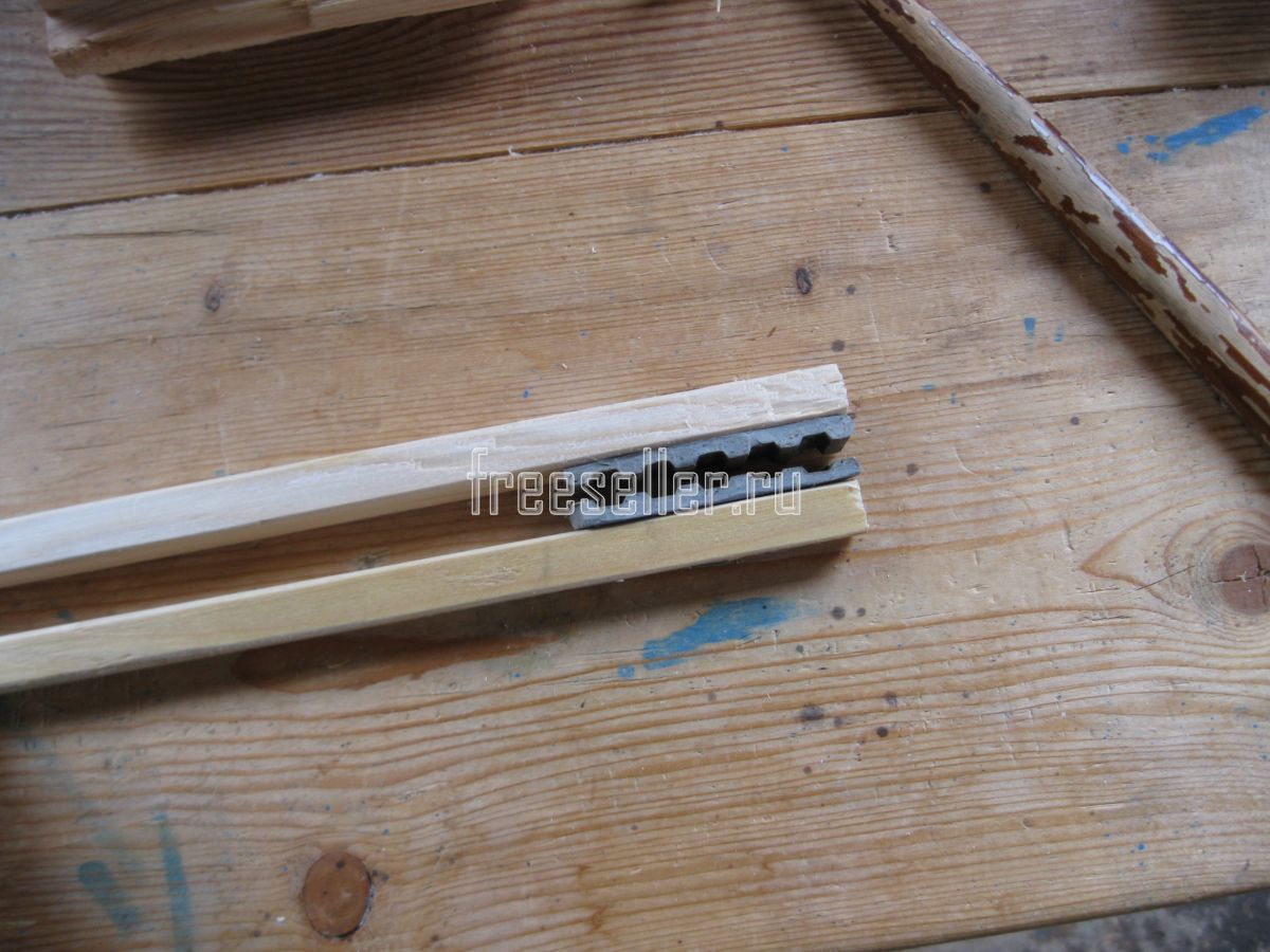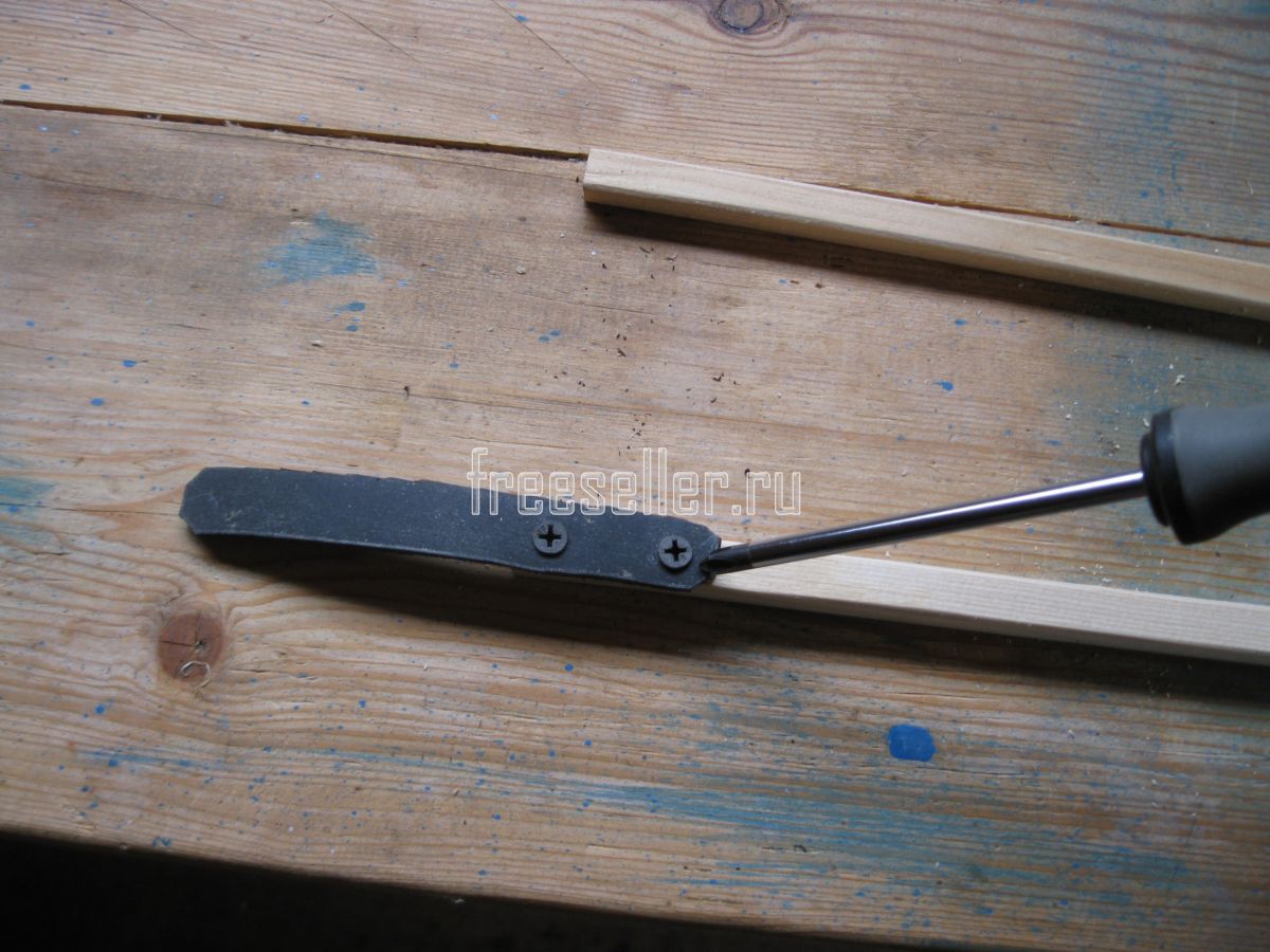 Затем взял полоску, вырезанную из прочной резины и, приложив ее к другим концам реек, просверлил в ней (а заодно и в рейках), отверстия под шурупы.