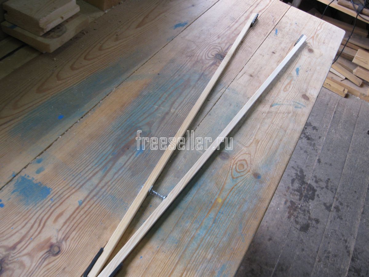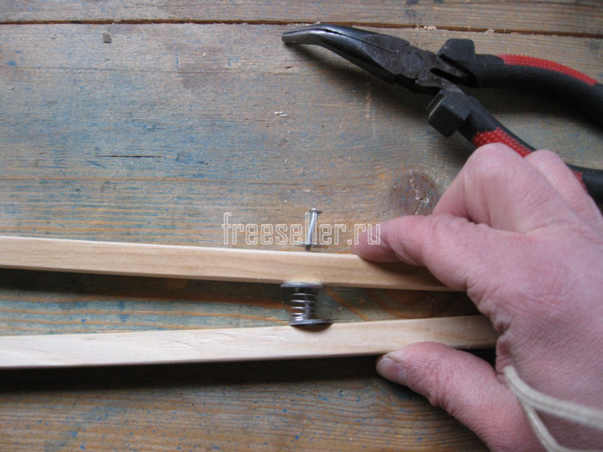 На расстоянии 20 см, от этих концов реек просверлил отверстие в одной из реек и вставил в него гвоздь, предварительно надев на него шайбы и пружину.