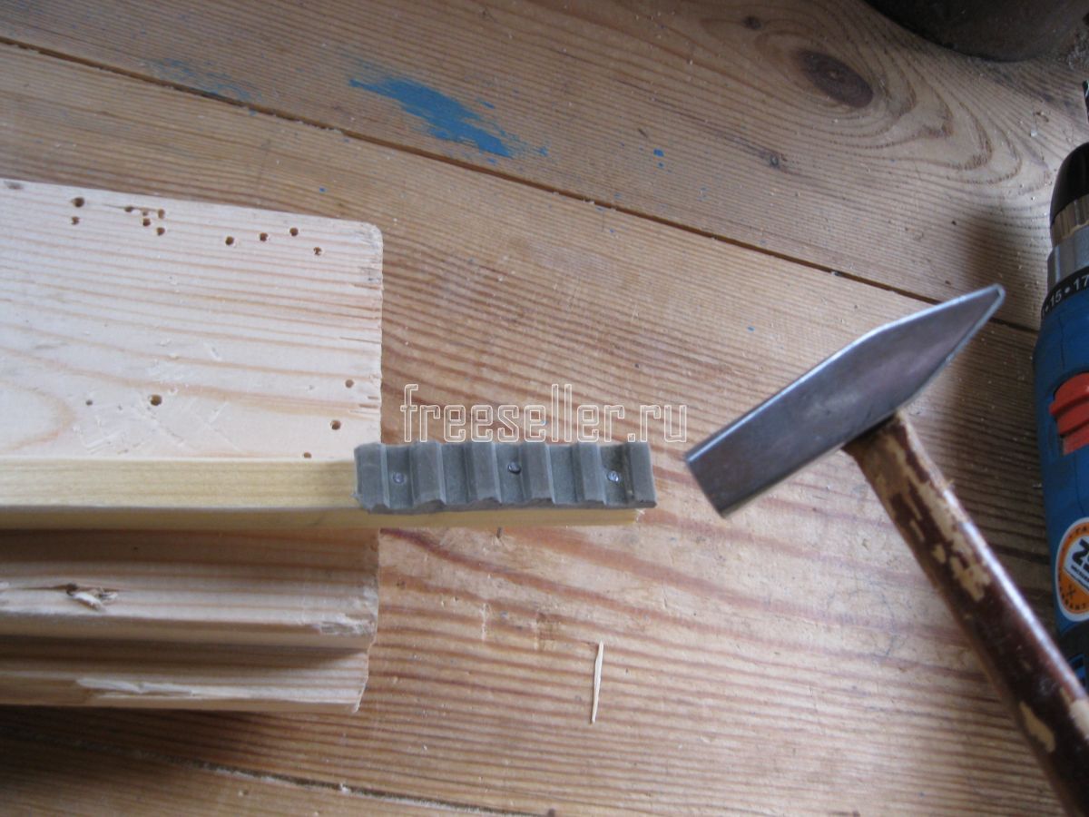 Сначала я прибил мелкими гвоздиками, ребристые резиновые накладки к концам деревянных реек. Эти накладки я вырезал из старого резинового коврика, и они будут служить в качестве губок щипцов.