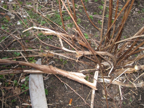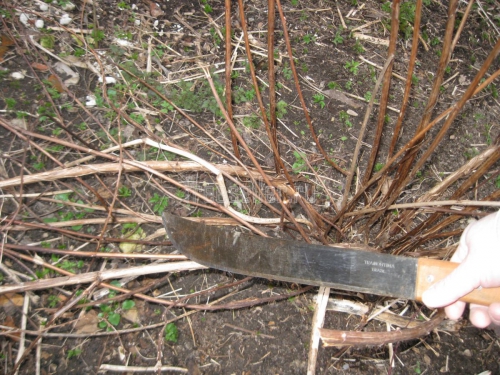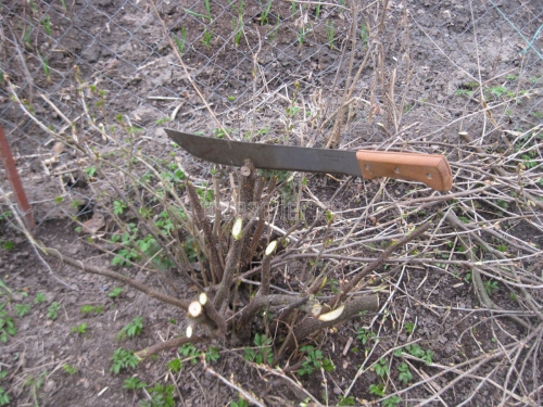 И вот тут нам на помощь может прийти мачете. Поскольку при помощи мачете мы можем очень быстро и без особых физических затрат обрубить все предназначенные для обрезки длинные ветви вокруг куста, оставляя от их оснований небольшие пеньки длиной 15-20 см.